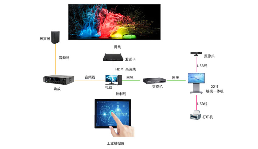 中小型会议室是企业日常沟通、远程会议、培训演示的核心场景,音视频方案的核心是显示清晰、人声通透、操作简单、稳定可靠,适配 20–100㎡空间,兼顾性价比与实用性。方案主要分为视频显示系统与音频扩声系统两大板块,其中视频显示以 LED 屏、液晶拼接屏、会议平板为主流,音频则以标准化会议设备满足拾音、扩声需求。